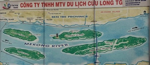 It took almost two hours to drive from Ho Chi Minh City (Saigon) to the town of Mo Thon where we took a boat over to Unicorn Island (Thoi Son), (bottom right on the map). It is one of the four mythical-creature-named islands (Dragon, Turtle, Phoenix, Unicorn) on the river, famous for its honey farms, fruit orchards and coconut candy workshops.